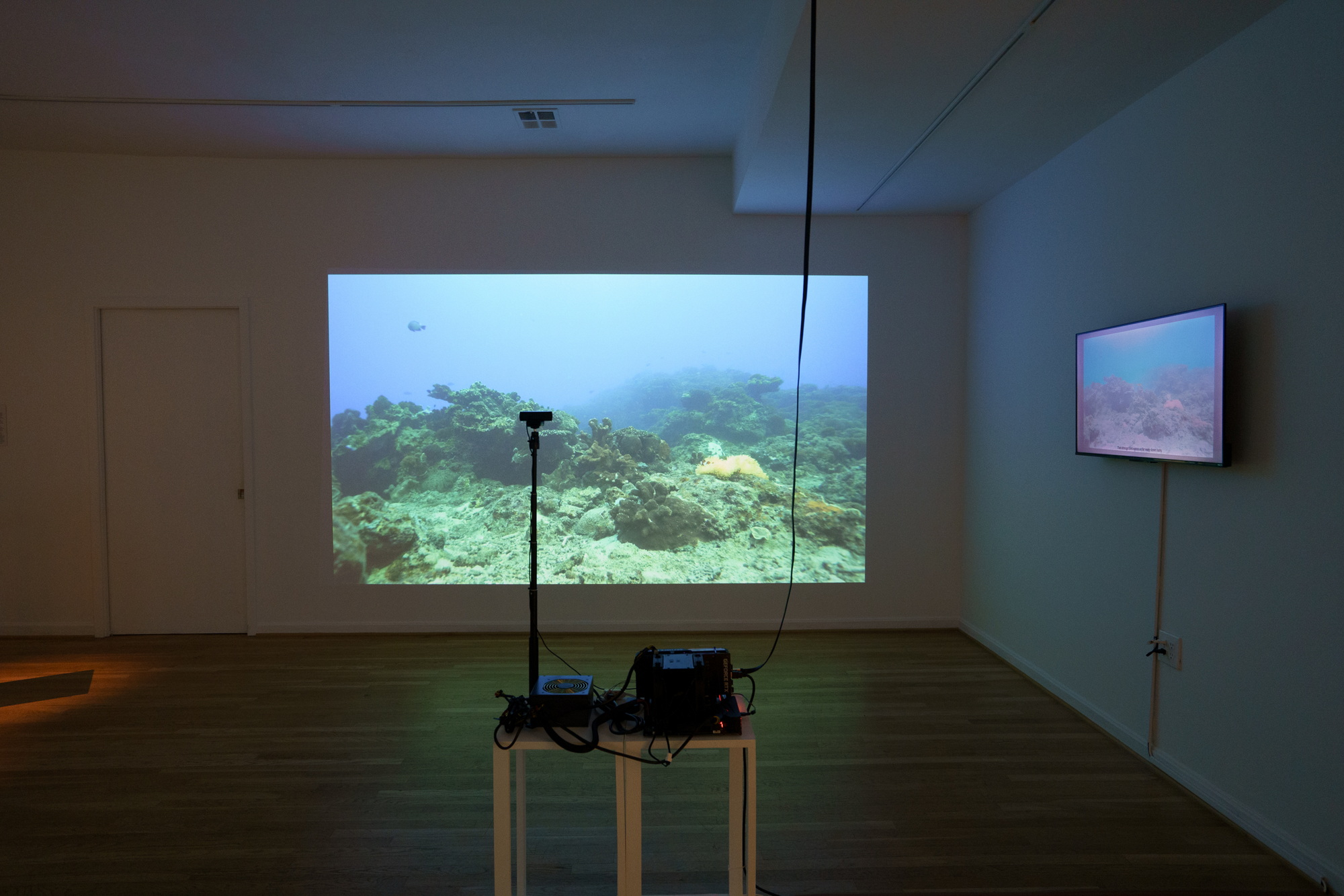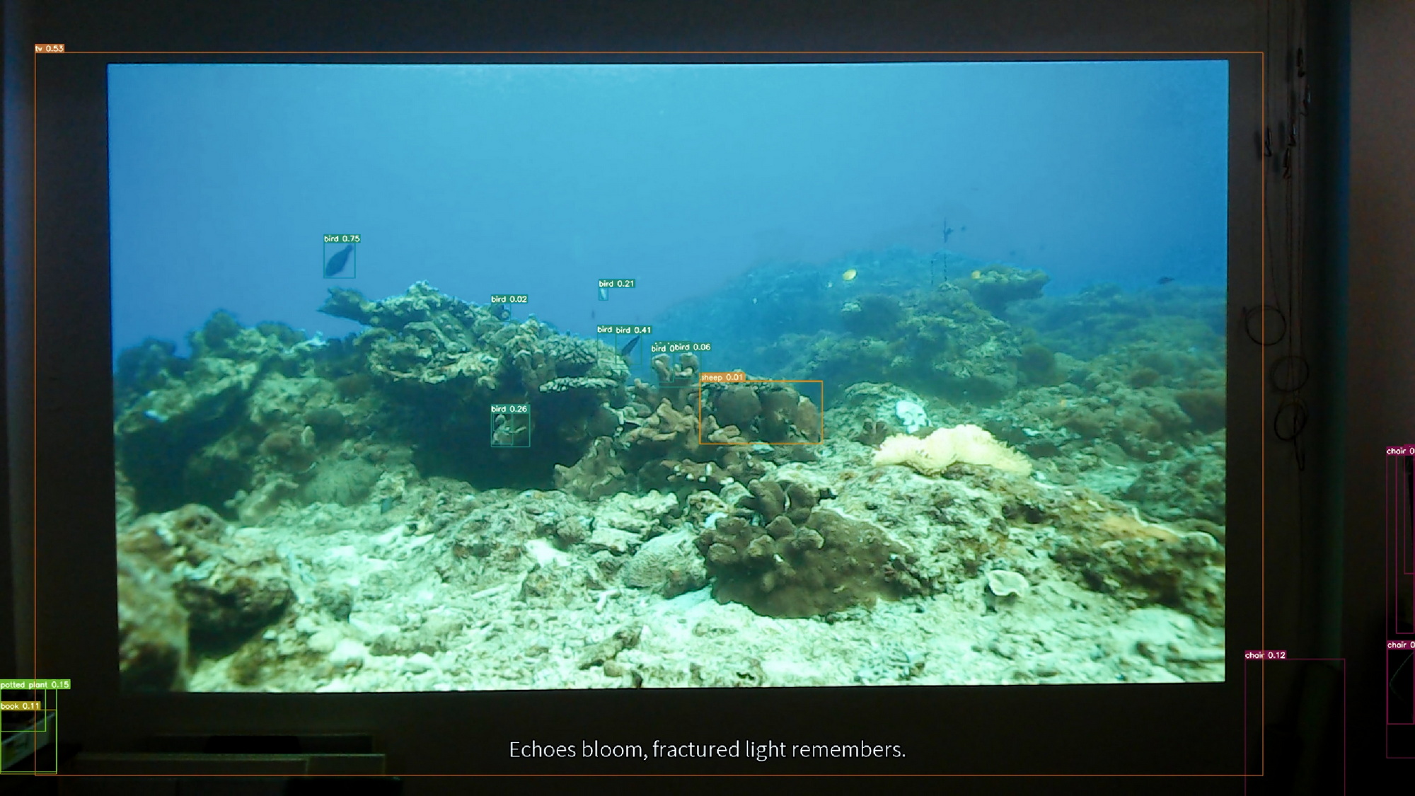 The AI real-time object detection system YOLO (You Only Look Once) watches a soothing aquarium scene together with the audience, featuring coral, sea anemones, and schools of fish. Although the imagery appears familiar and comforting, it represents an environment that YOLO cannot accurately comprehend. The footage was filmed underwater, resembling a tranquil aquarium, yet it holds the true depth and life of the ocean.