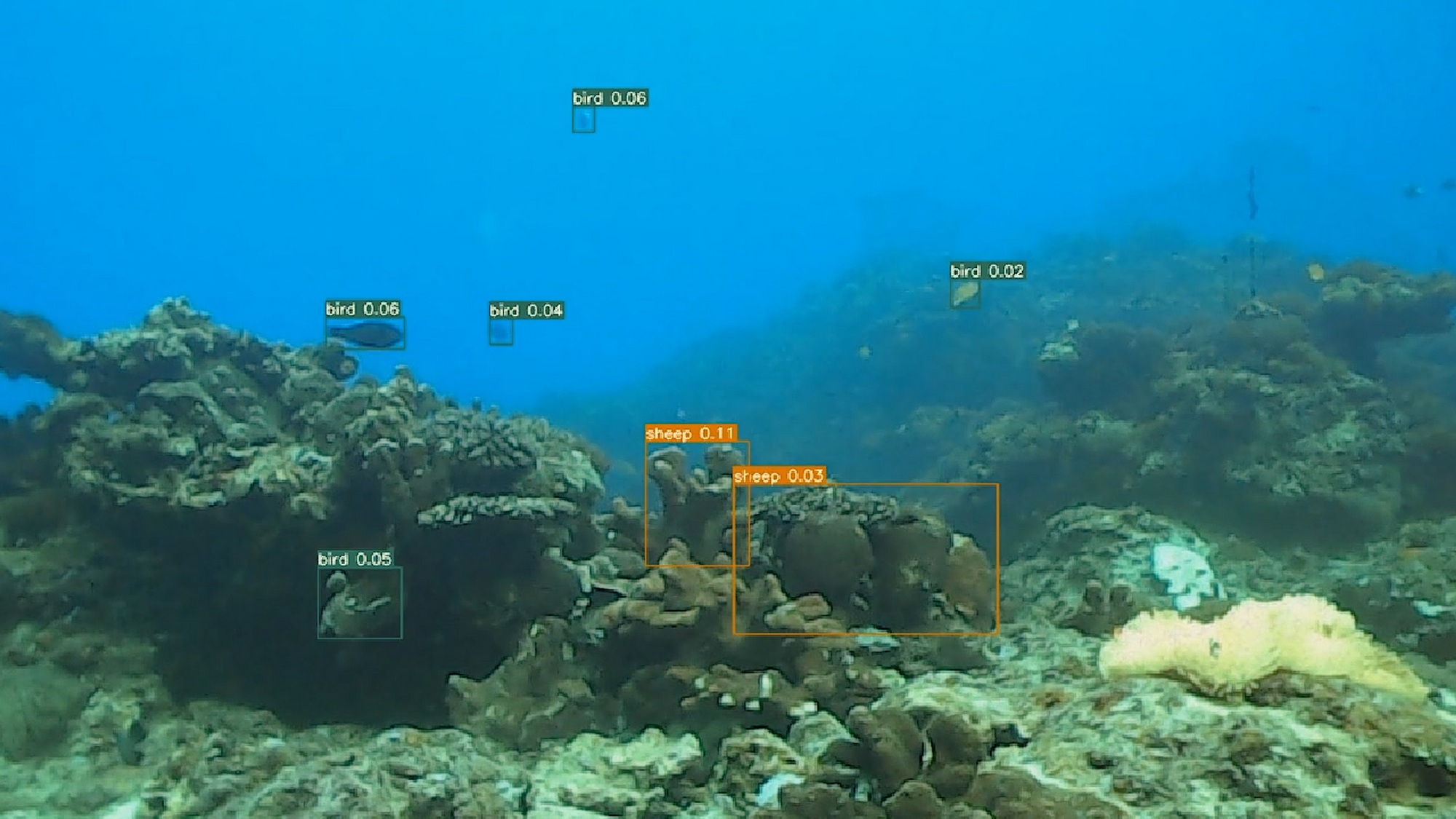 In the work, YOLO has only received limited object recognition training. Under unusually loose detection conditions, when it observes underwater creatures for the first time, it might misidentify a fish as a frisbee or interpret coral as broccoli. These “misjudgments,” when passed on to a large language model for sentence generation, create a layered dialectical relationship between the object, limited perceptual capacity, and mistaken judgment—unfolding an alternative form of narrative.